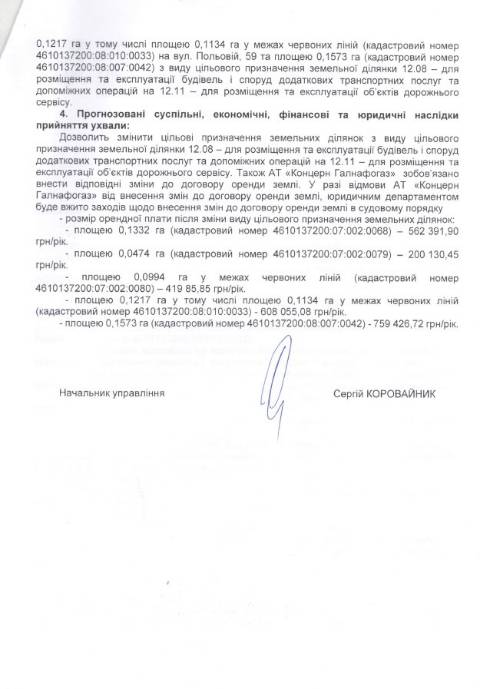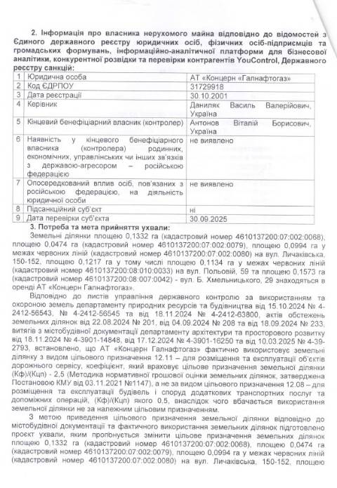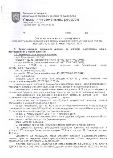 Згідно з документом, йдеться про три земельні ділянки площею 0,1332 га, 0,0474 га та 0,0994 га на вул. Личаківській, 150-152, ділянки площею 0,1573 га на вул. Б. Хмельницького, 292 та площею 0,1217 га вул. Польовій, 59 у Личаківському районі Львова, що перебувають у комунальній власності Львова. На цих ділянках знаходяться автозаправні комплекси площею 176 м², 271,2 м² та 48,9 м², що з 2005, 2013 та 2021 року перебувають у приватній власності АТ "Концерн Галнафтогаз". Фірма орендує ці земельні ділянки у міськради.