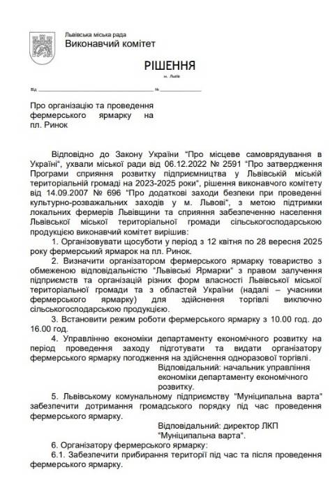 Сьогодні, 11 квітня, виконавчий комітет Львівської міської ради прийняв рішення про організацію та проведення фермерського ярмарку на Площі Ринок.