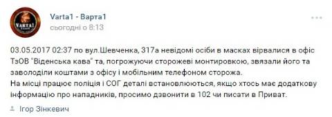 Депутат Львівської міської ради Ігор Зінкевич у спільноті "Варта 1" уточнив, що мова йде про офіс ТзОВ "Віденська кава", що розташований на вул. Шевченка, 317а.