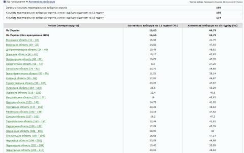 За даними ЦВК, явка виборців по всій Україні на цей час становила 45,22%.