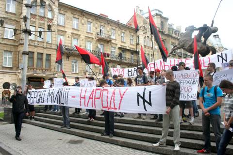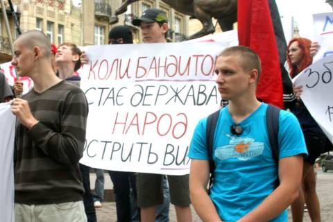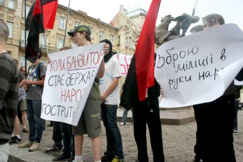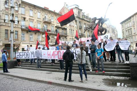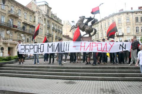 Кілька десятків людей вийшли на площу з плакатами «Ми вас звільняємо», «Зброю міліції - народу», «Народ проти міліції – міліція проти народу» та «Нам не потрібен ваш захист».