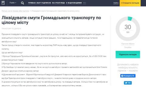 Додамо, 14 листопада, у Львові зареєстрували петицію з вимогою ліквідувати смуги для руху громадського транспорту по проспекті Чорновола, яка за 4 дні набрала необхідну для розгляду кількість голосів, однак львівські депутати не підтримали цю петицію.