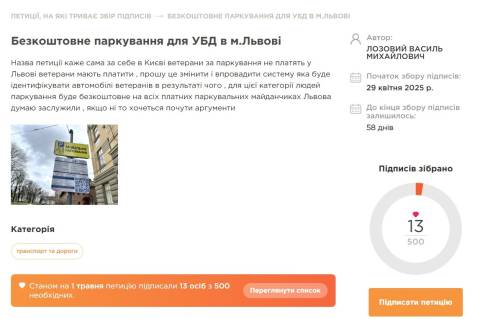 "Назва петиції каже сама за себе. В Києві ветерани за паркування не платять, у Львові ветерани мають платити. Прошу це змінити і впровадити систему яка буде ідентифікувати автомобілі ветеранів, в результаті чого для цієї категорії людей паркування буде безкоштовне на всіх платних паркувальних майданчиках Львова" – наголосив автор петиції.