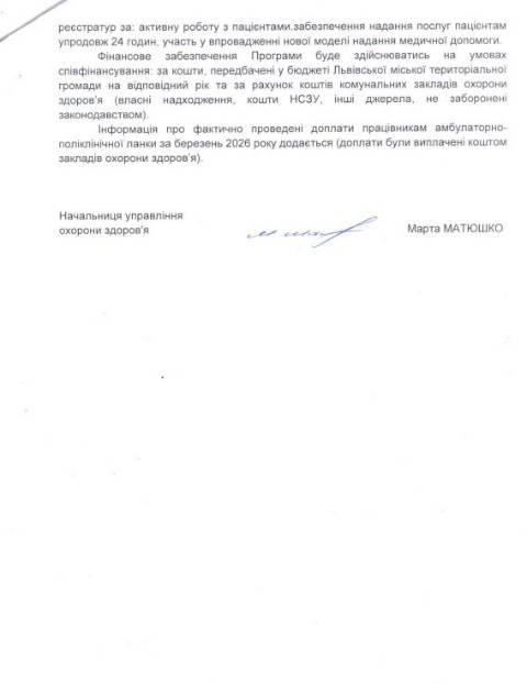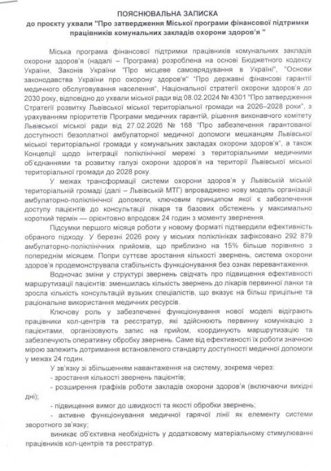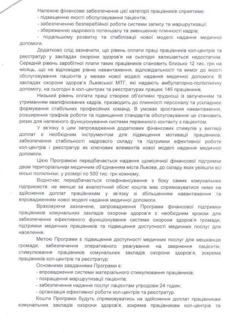 Згідно з документом, йдеться про виділення додаткових коштів з міського бюджету Львова на фінансування працівників комунальних закладів охорони здоров’я, навантаження на яких зросло через впровадження медичної реформи – зміну принципи роботи міських поліклінік.