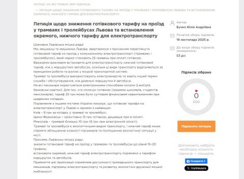 Зокрема, авторка петиції просить переглянути готівковий тариф на проїзд у міському електротранспорті, який наразі становить 25 гривень при оплаті готівкою, а також зменшити вартість проїзду у трамваях і тролейбусах.