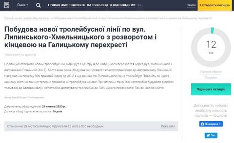 24 лютого, на порталі е-петицій Богдан Кужій зареєстрував петицію з вимогою побудувати нову тролейбусну лінії по вул. Липинського-Хмельницького з розворотом і кінцевою на Галицькому перехресті.