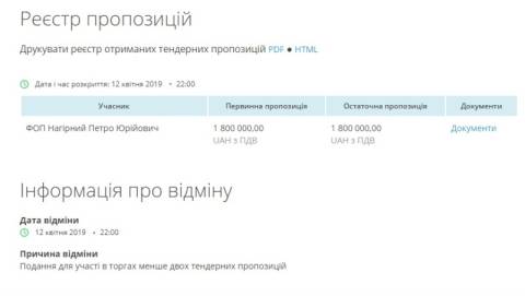 Аукціон стартував 15 квітня, своє документи для участі у нього подав лише один учасник – підприємець Петро Нагірний, однак закупівлю відмінили, адже для її проведення потрібно не менше двох учасників. Додамо, очікувана вартість послуг становила 1 850 000 грн.