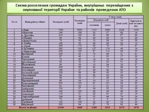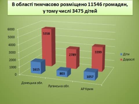Станом на сьогодні в області тимчасово розміщено 11546 переселенців, у тому числі 3475 дітей. Найбільше було зафіксовано вихідців із Донецької області – 5358 дорослих та 1615 дітей.
