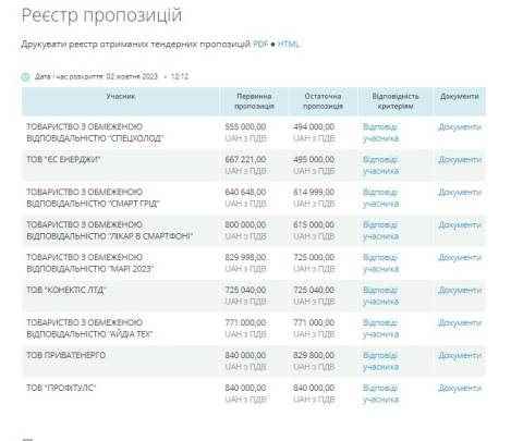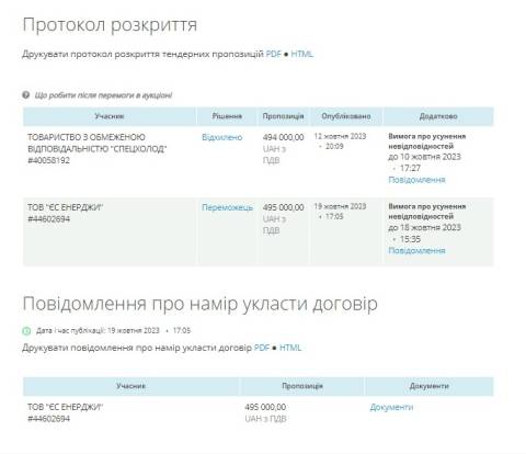 Аукціон стартував 2 жовтня, участь у ньому взяли 9 компаній, а переможцем обрали ТОВ "ЄС Енерджи" з пропозицією 495 000 грн. Натомість очікувана вартість послуг становила 850 000 грн.