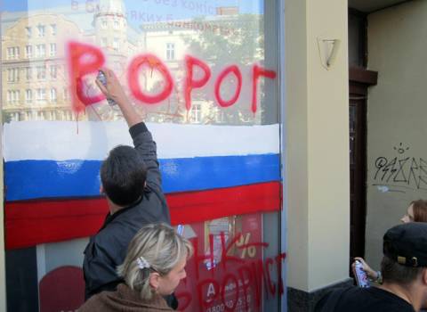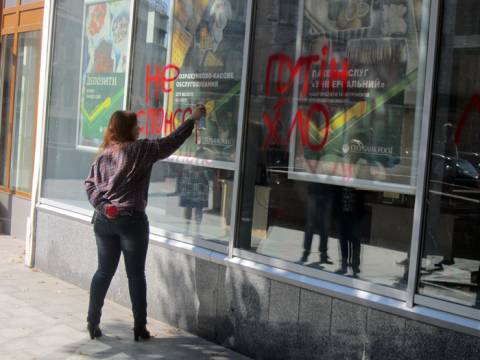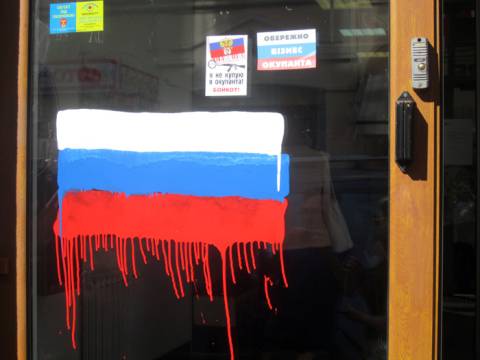 Учасники акції клеїли стікери з написом "Обережно, бізнес окупанта" та малювали фарбою російський триколор, а аерозольними фарбами наносили написи "ПТН ПНХ" та інші.
