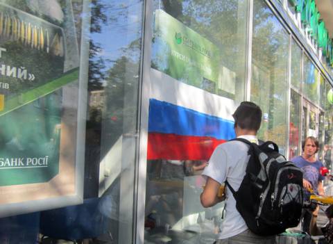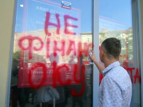Активісти маркували на вул. Валова "ВТБ", "Руський стандарт банк" та "Сбербанк" на та "Альфа банк" на площі Галицькій, 13.