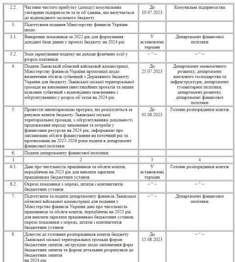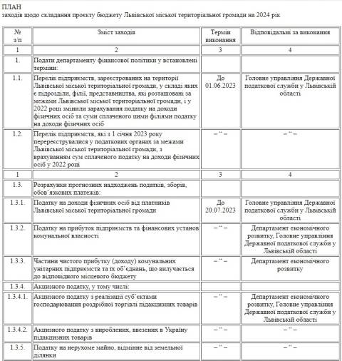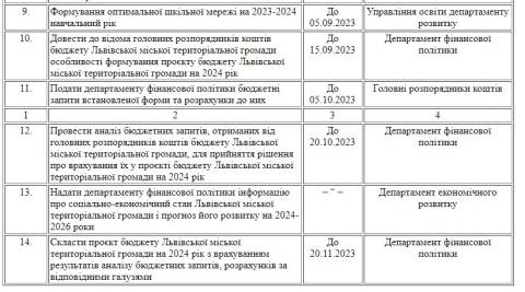 "Для забезпечення складання проєкту бюджету Львівської МТГ на 2024 рік у терміни, визначені бюджетним законодавством, затвердити план заходів щодо складання проєкту бюджету Львівської МТГ на 2024 рік" – йдеться у розпорядженні.