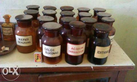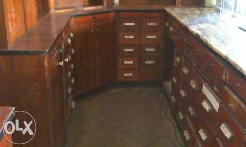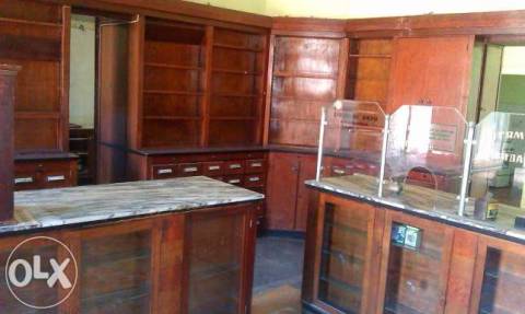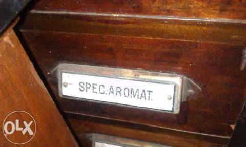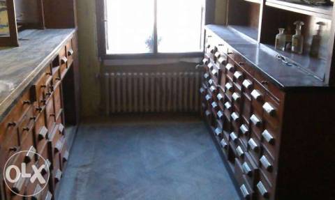 Автор написав у описі товару, що є багато стелажів, полиць, ящиків, прилавки, вітрини, рецептурний стіл. Матеріал – дерево, мармур, скло шліфоване, бронза. Продаються всі меблі, які підійдуть для аптеки або тематичного кафе.