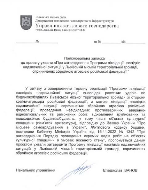На сайті Львівської міськради оприлюднили проєкт ухвали про затвердження Програми для ліквідації наслідків надзвичайних ситуацій у Львівській МТГ, спричинених збройною агресією РФ.