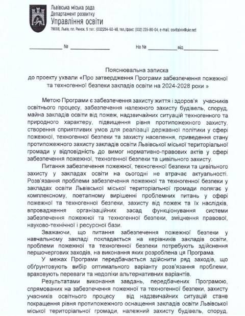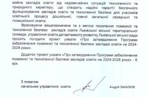 На сайті Львівської міськради підготували та оприлюднили проєкт ухвали про затвердження Програми забезпечення пожежної та техногенної безпеки закладів та установ освіти на 2024-2028 роки.
