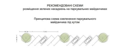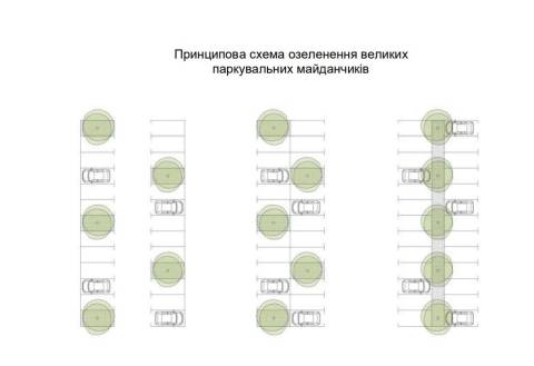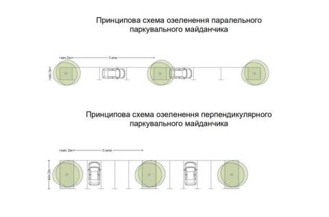 Зокрема, для перпендикулярного паркування рекомендують висаджувати не менше одного дерева на кожні п’ять машиномісць, а для паралельного – не менше одного дерева на кожні три машиномісця. При цьому дерева у дорослому віці повинні досягати не менше 15 метрів заввишки.