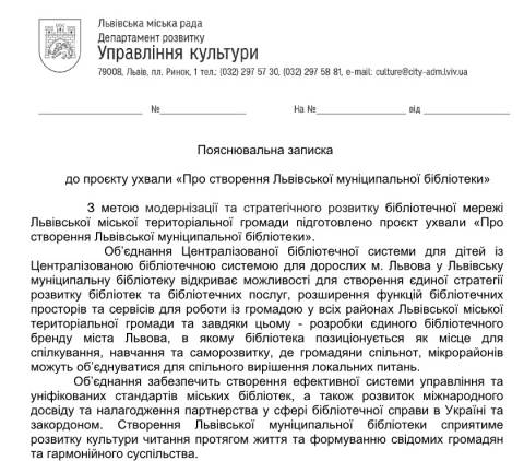 "Створити Львівську муніципальну бібліотеку шляхом реорганізації Централізованої бібліотечної системи для дорослих м. Львова та Централізованої бібліотечної системи для дітей м. Львова. Утворити комісії з припинення: Централізованої бібліотечної системи для дорослих м. Львова шляхом злиття у Львівську муніципальну бібліотеку та затвердити її персональний склад; Централізованої бібліотечної системи для дітей м. Львова шляхом злиття у Львівську муніципальну бібліотеку та затвердити її персональний склад" – йдеться у проєкті ухвали.