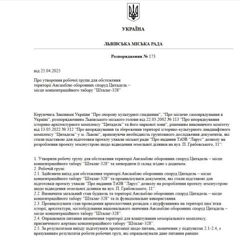 "Враховуючи необхідність ґрунтовного дослідження документів, які стали підставою для підготовки проєкту ухвали міської ради "Про надання ТзОВ "Ларус" дозволу на розроблення проєкту землеустрою щодо відведення земельної ділянки на вул. П. Грабовського, 11, утворити робочу групу для обстеження території Ансамблю оборонних споруд Цитадель – місце концентраційного табору "Шталаг-328" та затвердити її склад" – йдеться у розпорядженні.