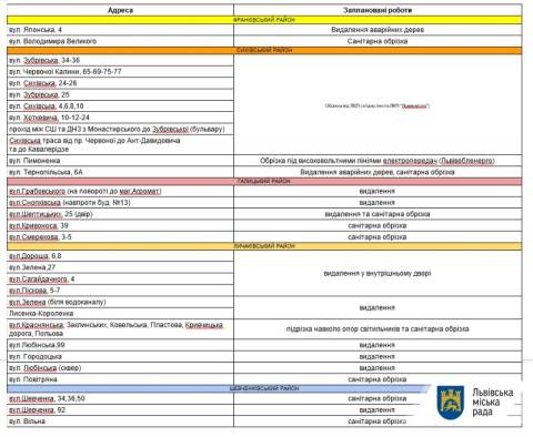 "У період з 3 лютого по 7 лютого на восьми вулицях міста заплановано проведення санітарної обрізки та на одинадцяти – видалення аварійних дерев. У місцях видалених дерев буде проведено компенсаційну висадку зелених насаджень" – зазначають в управлінні екології та природних ресурсів Львівської міськради.