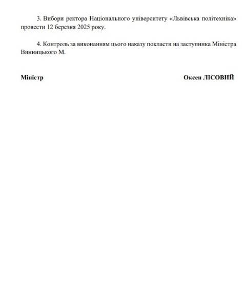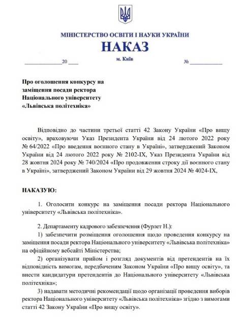 Міністерство освіти та науки України сьогодні видало наказ про оголошення та проведення конкурсу на заміщення посади ректора Національного університету "Львівська політехніка".