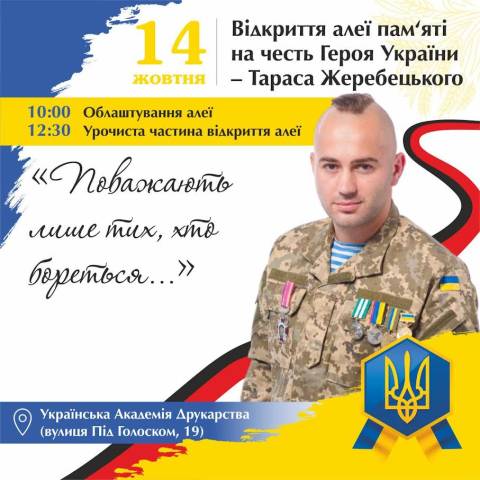 У п'ятницю, 14 жовтня, на вул. Під Голоском, 19 у Львові відбудеться відкриття Алеї пам'яті на честь Героя України, бійця 80-ої окремої десантно-штурмової бригади Десантно-штурмових військ ЗСУ Тараса Жеребецького, який загинув на фронті.