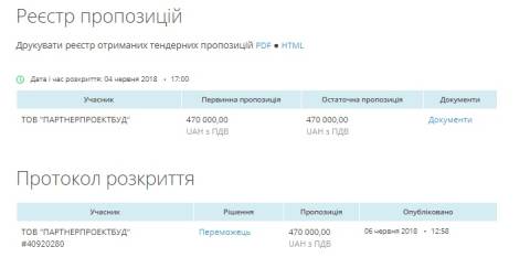 Взяти участь у тендері зголосилася лише одна фірма: ТОВ "Партнерпроектбуд", яка і стала переможцем конкурсу. Підприємство запропонувало 470 000 гривень за свої послуги.