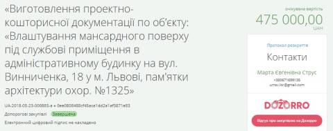 Львівська обласна рада 23 травня оголосила тендер на виготовлення проектно-кошторисної документації по об’єкту: "Влаштування мансардного поверху під службові приміщення в адміністративному будинку на вул. Винниченка, 18 у м. Львові, пам'ятки архітектури охор. №1325".