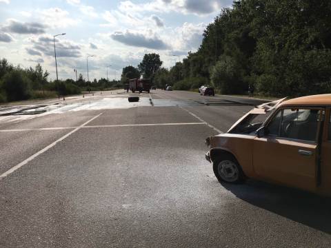 На вул. Шевченка через зіткнення ВАЗу та асенізаційного авто з останнього вилетів на дорогу та загорівся газовий балон.
