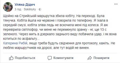 Волонтерака Уляна Дідич на своїй сторінці у Facebook стверджує, що загибла переходила дорогу на червоний сигнал світлофора і розмовляла по телефону.