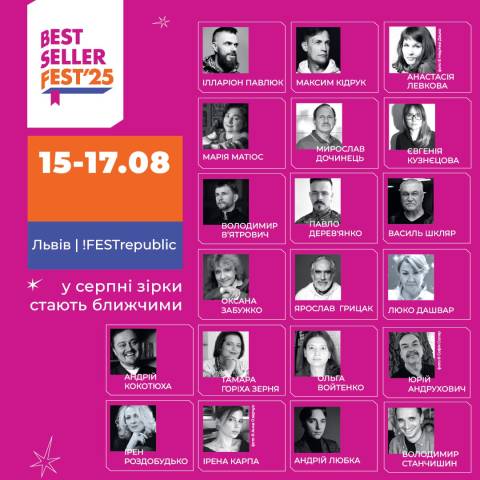 Серед авторів бестселерів, які приїдуть на BestsellerFest 2025, – Оксана Забужко, Марія Матіос, Євгенія Кузнєцова, Ілларіон Павлюк, Василь Шкляр, Ірена Карпа, Юрій Андрухович, Павло Дерев’янко, Андрій Кокотюха, Максим Кідрук, Андрій Любка, Анастасія Левкова, Мирослав Дочинець, Люко Дашвар, Ірен Роздобудько, Галина Пагутяк, ТамараГоріха Зерня, Ольга Войтенко, Володимир В’ятрович, Володимир Станчишин, Ярослав Грицак та інші.