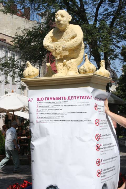 Сьогодні у Львові на Площі Ринок, біля входу в Ратушу, громадянський рух "Чесно" встановив "Стовп ганьби".