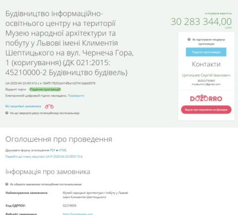 Музей народної архітектури і побуту у Львові імені Климентія Шептицького оголосив повторний тендер у системі ProZorro на будівництво інформаційно-освітнього центру на території Музею народної архітектури та побуту у Львові імені Климентія Шептицького на вул. Чернеча Гора, 1 (коригування), які переможець тендеру має здійснити до 31 грудня 2021 року.