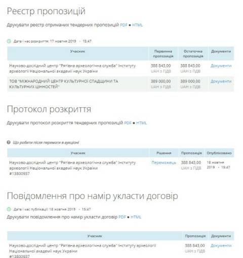 Аукціон стартував 17 жовтня, участь у ньому взяли Науково-дослідний центр "Рятівна археологічна служба" Інституту археології Національної академії наук України та ТОВ "Міжнародний центр культурної спадщини та культурних цінностей".