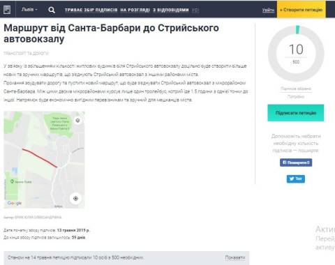 Вчора, 13 травня, на порталі е-петицій була зареєстрована петиція Юлії Брик з вимогою розробити маршрут від Санта-Барбари до Стрийського автовокзалу.