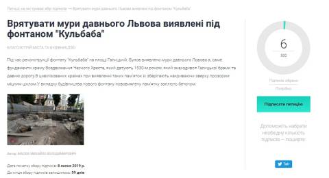8 липня на порталі е-петицій Михайло Масюк зареєстрував петицію з вимогою врятувати мури давнього Львова, які виявили під фонтаном "Кульбаба".