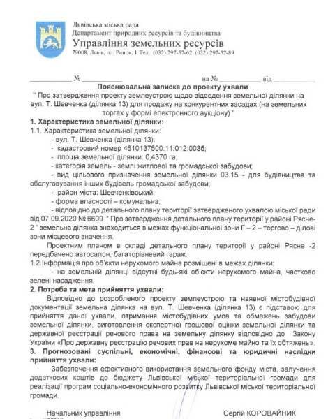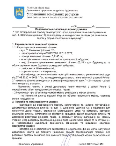 На сайті Львівської міськради оприлюднили проєкт ухвал, якими планують затвердити проєкти землеустрою щодо відведення двох земельних ділянок на вул. Т. Шевченка для продажу у власність на земельних торгах у формі електронного аукціону.