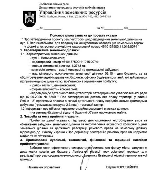 Згідно з документом, на продаж у приватну власність планують виставити дві земельні ділянки у Шевченківському районі Львова, які передбачені під офіси та житлову забудову.