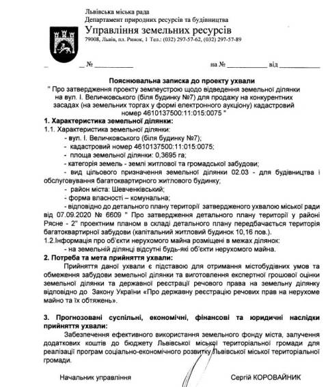 У міськраді напрацювали проєкти ухвал про продаж на аукціоні земельних ділянок на вул. Величковського.