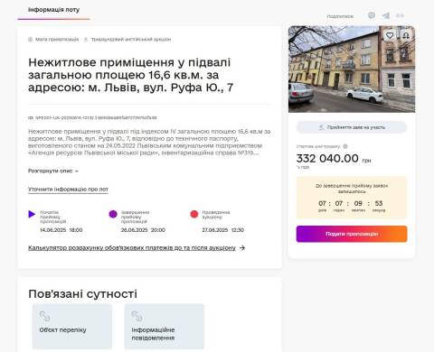 Торги відбудуться 27 червня у системі ProZorro з початковою ціною – 332 040 гривень.