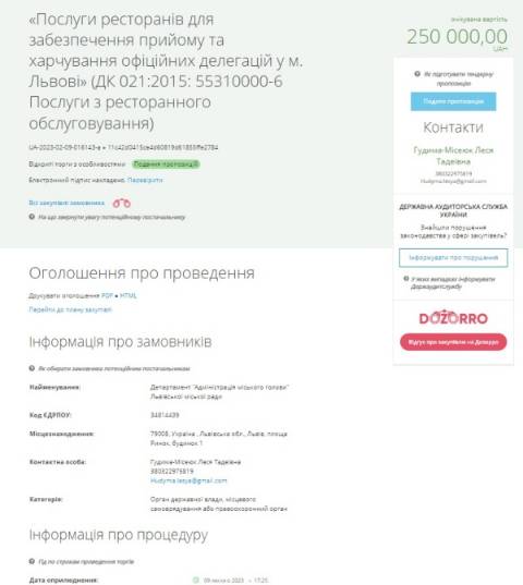Департамент "Адміністрація міського голови" Львівської міської ради оголосив закупівлю у системі ProZorro на послуги ресторанів для забезпечення прийому та харчування офіційних делегацій у Львові, які переможець тендеру має надавати міськраді до 31 грудня 2023 року.