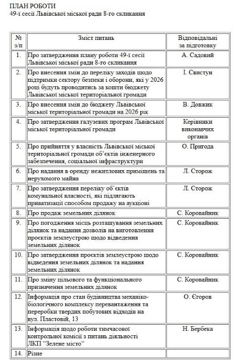 Серед питань, які розглядатимуть депутати, – внесення змін до бюджету Львівської міської територіальної громади на 2026 рік, затвердження галузевих програм Львівської МТГ, а також інформація про стан будівництва механіко-біологічного комплексу перевантаження та переробки твердих побутових відходів на вул. Пластовій, 13.