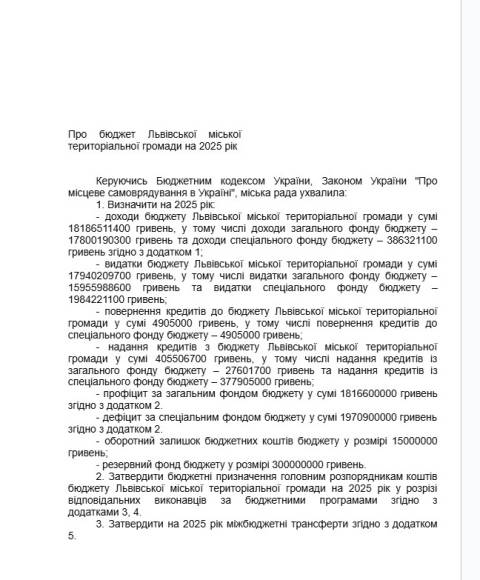 На сайті Львівської міськради оприлюднили проєкт ухвали про бюджет Львівської міської територіальної громади на 2025 рік.