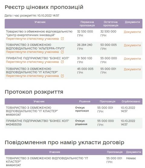 Аукціон стартував 10 жовтня, участь у ньому взяли чотири компанії, а переможцем обрали ТзОВ "ІТ Кластер", що запропонувало найвищу ціну у 55 000 001 грн.