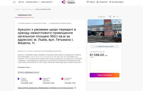Управління комунальної власності Львівської міської ради виставило на аукціон з оренди у системі ProZorro приміщення на вул. Гетьмана І. Мазепи, 11 у Львові загальною площею 360,1 м².
