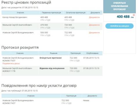 Аукціон стартував 7 серпня, участь у ньому взяли Назар Качор, Сергій Мальков та Сергій Новіков, які запропонували придбати нерухомість за 400 488 грн, 720 000 грн й 722 000 грн відповідно. Переможцем обрали Сергія Новікова, а початкова вартість приміщення становила 400 488 грн.