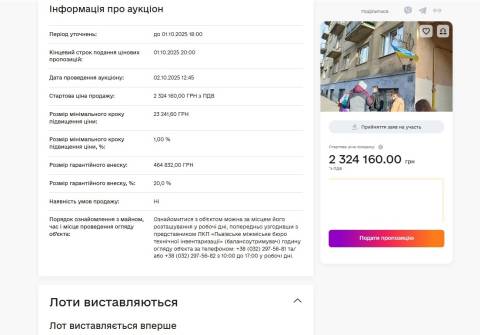 Аукціон стартує 2 жовтня, а початкова вартість приміщення становить 2 324 160 грн.