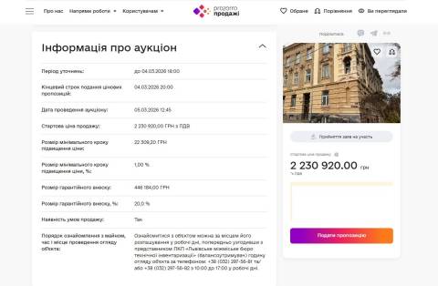 Аукціон стартує 5 березня, а початкова вартість приміщення становить 2 230 920 грн.
