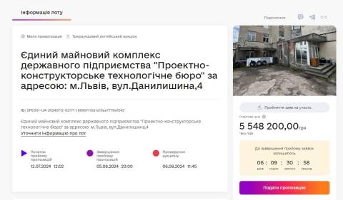 Фонд держмайна виставив на продаж єдиний майновий комплекс державного підприємства "Проектно-конструкторське технологічне бюро", що знаходиться на вул.Данилишина, 4 у Львові.
