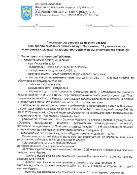 Згідно з документом, йдеться про ділянку площею 0,1434 га, що знаходиться на вул. Персенківці, 13 у Сихівському районі Львова й перебуває у комунальній власності Львова. На цій ділянці відсутні будь-які об’єкти нерухомості.