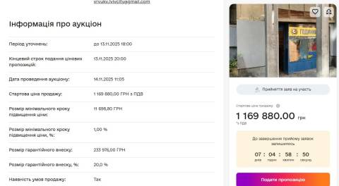 Аукціон стартує 14 листопада, а початкова вартість приміщення становить 1 169 880 грн.